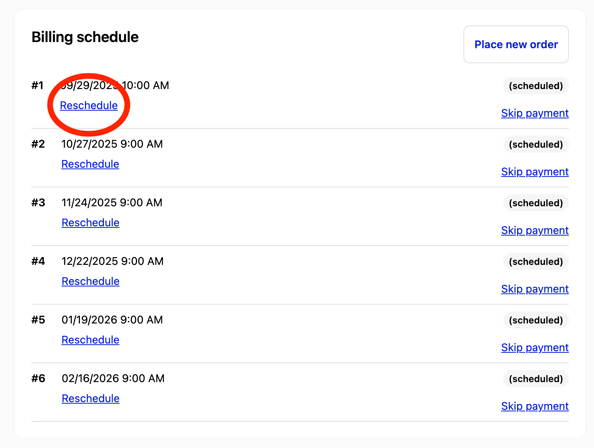 Place Order Now and Reset Schedule → Sends an order immediately and moves your next refill 4 weeks later.